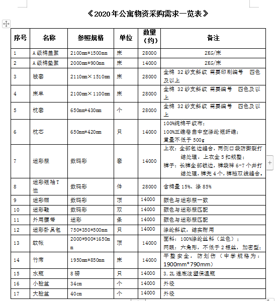 1、投标单位投标前需缴纳投标保证金3000元,其中三件套、棉絮项目需交投标保证金10000元,未中标的单位无息原数退回,中标单位将自动转为合同履约金,完成项目到货后原数无息退回。
