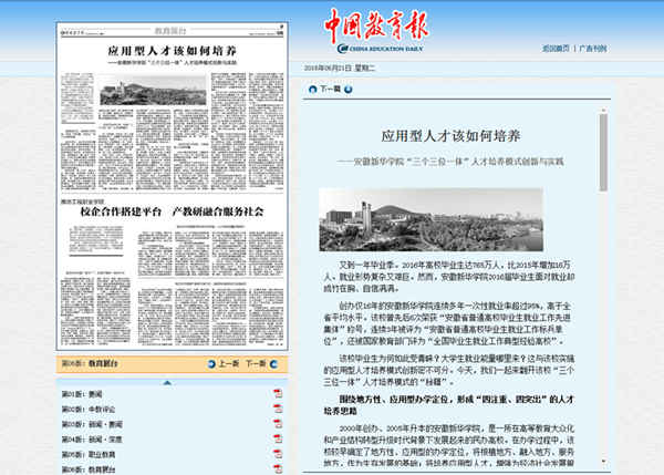 实践证明,“三个三位一体”的应用型人才培养模式积极回应了人的发展和经济社会发展对教育的要求,较好地协调了应用型人才的“知识、能力、素质”三者之间的关系,以及“用得上、留得住、发展好”三者之间的关系,充分体现了“育人为本、服务社会”的教育理念。2015年,37000cm威尼斯被遴选为安徽省地方应用型高水平大学立项建设单位,该校把“以培养社会责任感、创新精神和实践能力为核心的人才培养改革深化工程”作为建设地方应用型高水平大学的“十大工程”之一。我们相信,随着“三个三位一体”人才培养模式改革的进一步深化,越来越多的新华学子能够凭借过硬的能力素质,迎来属于自己的似锦繁花。(文/代玲玲)