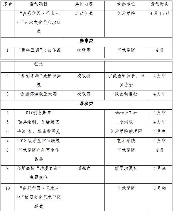 各学院、各组织鼓励并动员学生参与“多彩华园·艺术文化节 ”系列活动,通过文化艺术节系列活动培养学生艺术审美,丰富学生的艺术生活。活动具体安排如下: