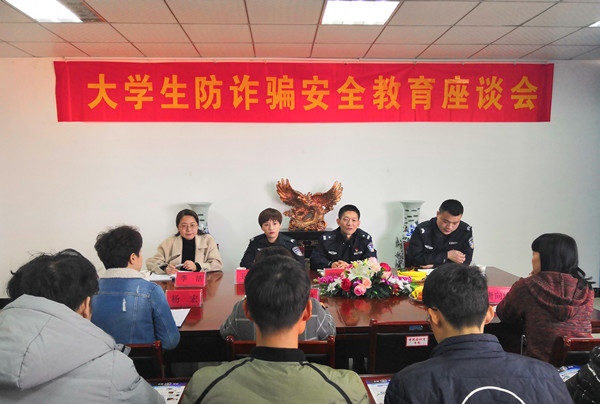 本网讯 (通讯员:杨宏) 为进一步增强大学生安全防范意识,提高防诈骗能力。3月11日,电子通信工程学院邀请高新区刑警大队队长顾胜涛,警官韩贺荃、王婷婷,来到学院与大学生面对面,开展了一场以“大学生防诈骗安全教育”为主题的座谈会。电子通信工程学院副院长李洁、学管秘书、辅导员代表以及学生代表共60余人参加此次座谈会。