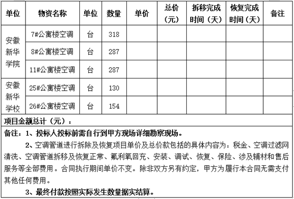 1)37000cm威尼斯7#、8#、11#公寓楼和安徽新华学校的25#、26#公寓楼的空调内机拆移、安装恢复项目