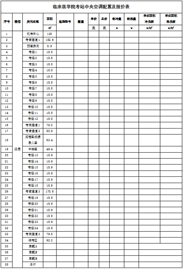 4.项目概况: 根据采购需求,对临床医学院2号实验楼4楼考站中央空调项目进行询价招标,考站建筑面积约1400余平方,空调配置详见服务需求。