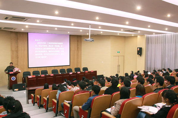 本网讯(学生记者:陶文、孙菲菲)为纪念第13个中国记者节,11月13日中午,由办公室和校团委共同举办、大学生记者团承办的第二届记者活动月开幕仪式在学术报告厅举行。《中国健康报》安徽记者站站长、安徽卫生厅新闻办主任、主任记者冯立中,学生处处长、校团委书记朱兆健,办公室副主任马琪、盛晓青,学生处副处长汪俊东、《新华学院报》主编张昌顺副教授及百余名师生齐聚一堂,共同探讨校园记者的成章之径。开幕式上,冯立中为在场学子奉献了一场精彩的新闻知识讲座。