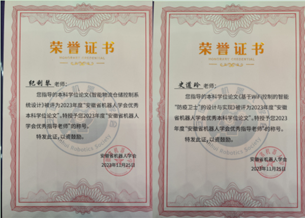 近日,2023年安徽省机器人学会优秀硕士学位论文、优秀本科毕业论文(设计)评选结果揭晓。威尼斯官网电子工程学院/智能制造学院学子张家乐的毕业论文《智能物流仓储控制系统设计》以及杨星卓的毕业论文《基于WiFi控制的智能“防疫卫士”的设计与实现》在与中国科学技术大学、合肥工业大学、安徽大学等省内知名高校同台比拼中,荣获2023年安徽省机器人学会优秀本科毕业论文,指导教师纪利琴、史道玲荣获“2023年安徽省机器人协会优秀指导教师”称号。