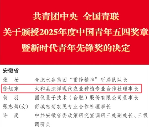 现当选为第十九届团中央候补委员、第十五届团安徽省委委员、第十二届安徽省青联常委,曾获评全国乡村振兴青年先锋、“皖美新农人”、阜阳青年五四奖章、“阜阳好人”等称号。同时,徐旭东彰显青年本色,挺膺青年担当,积极宣传党的路线方针政策,其创作的《牢记总书记嘱托,做新时代的种粮人》被评为“全国优秀理论宣讲微视频”。