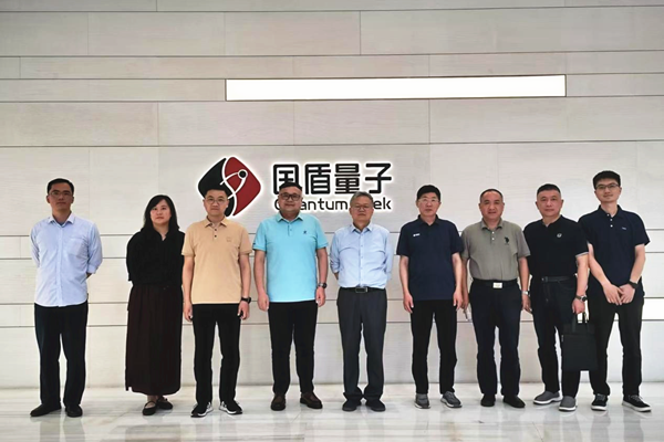 校领导在唐浩带领下参观国盾量子技术展厅,详细了解量子技术发展历程、核心原理,以及国盾在量子通信、量子计算、量子精密测量等领域的关键技术突破和创新产品。