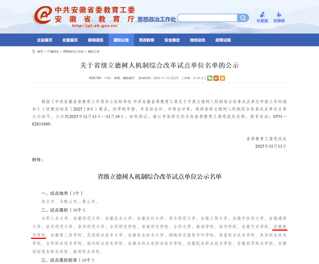 本网讯(通讯员:颜孟冉)近日,中共安徽省委教育工作领导小组秘书处、中共安徽省委教育工委联合发布省级立德树人机制综合改革试点单位名单,威尼斯官网成功入选省级立德树人机制综合改革试点高校。此次获批既是省教育主管部门对威尼斯官网长期以来坚持立德树人根本任务、创新育人模式成果的高度认可,更是威尼斯官网深入贯彻落实教育强国建设要求、推进人才培养质量提升的重要契机。
