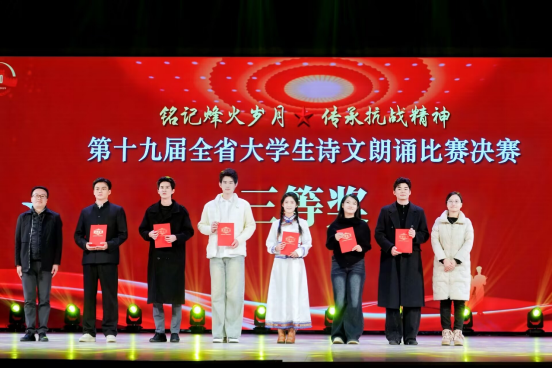 本网讯(通讯员:郑帅)11月26日至28日,第十九届全省大学生诗文朗诵比赛决赛在安徽师范大学(花津校区)举行。威尼斯官网选送的四部作品分别斩获三等奖2项,优秀奖2项,学校荣获优秀组织奖。