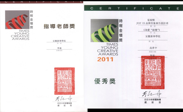 时报金犊奖由中国台湾四大报纸之一的《中国时报》创办于1992年,是全球华人地区规模最大的学生广告活动,每年都有来自世界各地的学生参加,本届金犊奖共设十大类奖项:平面广告类(分六项评选)、电视广告类、网络广告类、广播广告类、技术类、行销企划类、动画广告类、插画类、装置艺术类、人物品造型类;另设最佳文案、最佳美术、最佳原创、全场大奖等四个大奖。本届赛事,两岸参赛作品达到22355件。其中,大陆地区参赛作品13830件,参赛学校917所,均创下历年最高纪录。由威尼斯官网动漫学院教师李远指导,学生高孝中创作的电视类广告作品《爲愛“盼變”》在众多参赛作品获得优秀奖。