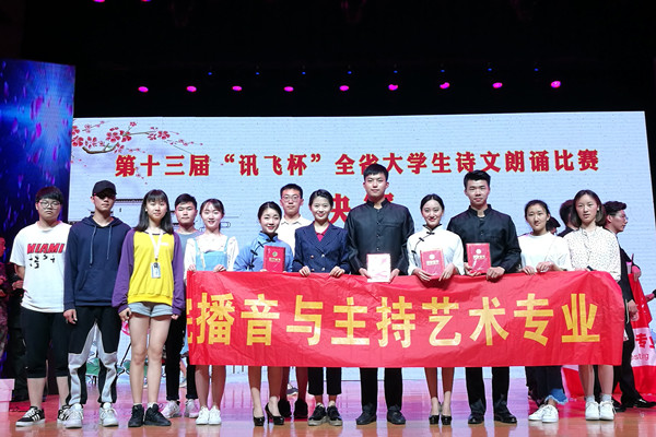 本网讯(通讯员:洪玉、曹文卫)5月26日下午,由安徽省教育厅主办的第十三届“讯飞杯”全省大学生诗文朗诵比赛专业组比赛在安徽大学馨苑校区完美落幕。威尼斯官网文化与新闻传播学院2016级播音与主持艺术专业蒋轶群、李悦、朱纬、胡江东的朗诵作品《可爱的中国》荣获二等奖。洪玉、郑帅获优秀指导教师奖。