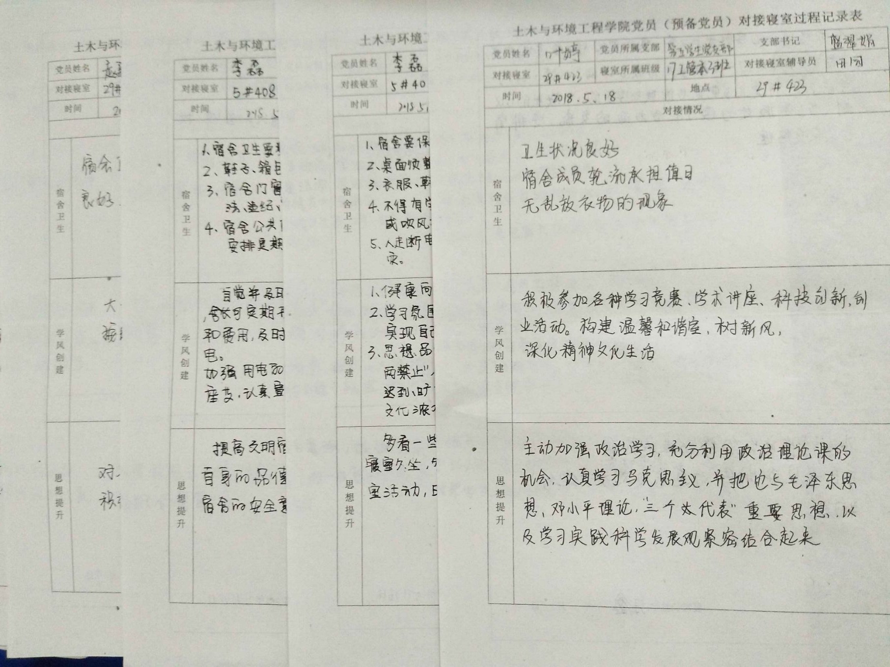 土木与环境工程学院“公寓+党建”活动主要通过亮身份、结对子、抓推进的方式来开展。即对所有学生党员寝室挂牌,使大家亮出党员身份,认识到自己的责任。其次,一名学生党员对接一间新生寝室,要求党员学生每周与对接宿舍深入交流,从寝室卫生、学业指导、大学规划等方面实施对接工作。再次,每月开展一次党建进公寓的总结活动,师生一起交流工作开展情况,及时解决过程中遇到的问题、扎实推进工果。