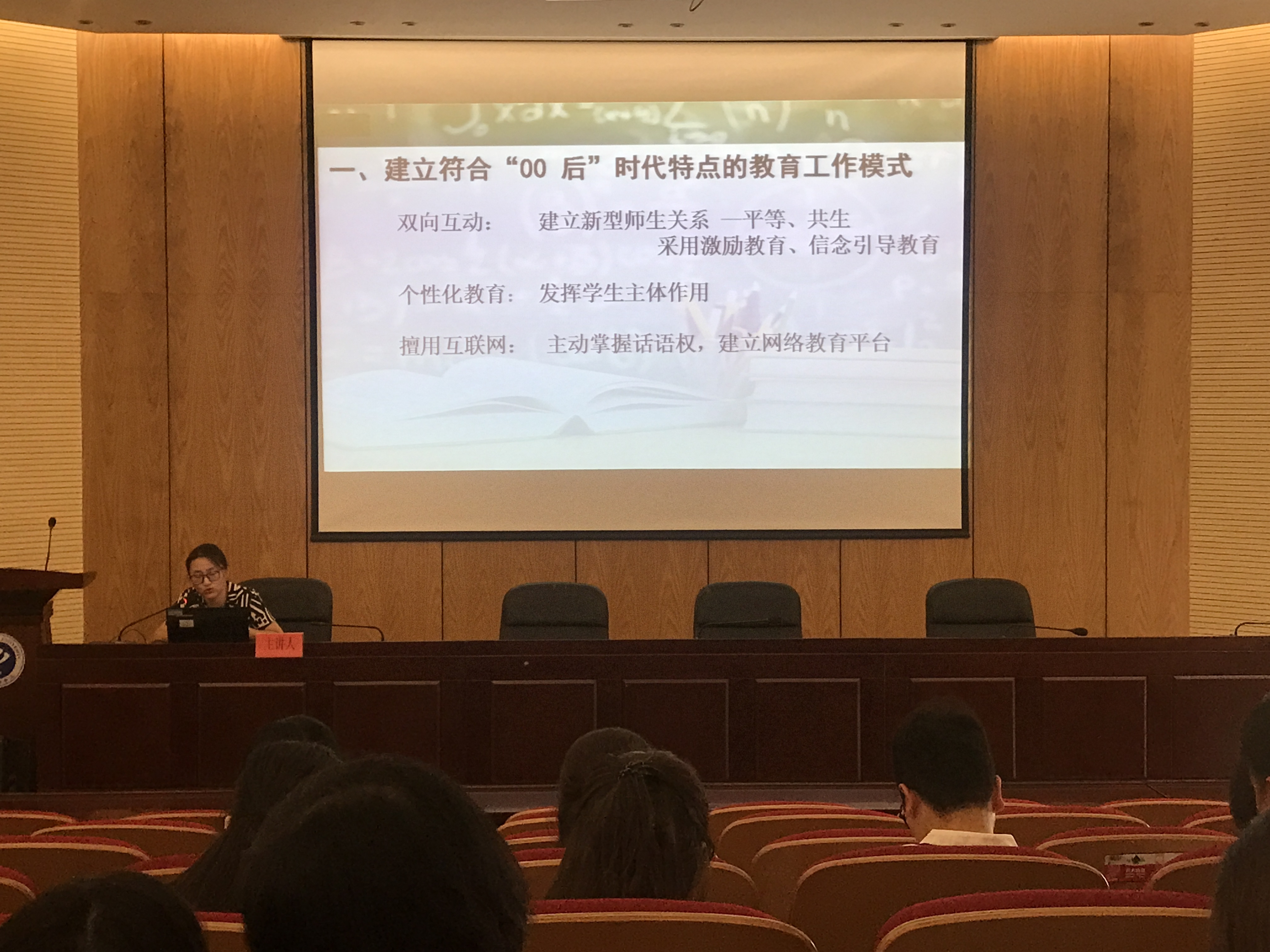 本次培训首先由电子通信工程学院学管秘书陈丽作“00后大学生教育模式探讨”的主题交流。陈丽分别从不一样的00后、不一样的教育模式、工作感悟三个方面引经据典,详细讲解了当代大学生的所处的时代背景及性格特点,提出应使用双向互动、个性化教育等方法因材施教,与时俱进的开展学生管理工作,同时建议大家加强总结反思,注重成果转化,争取更好更快的成长为专家化辅导员。