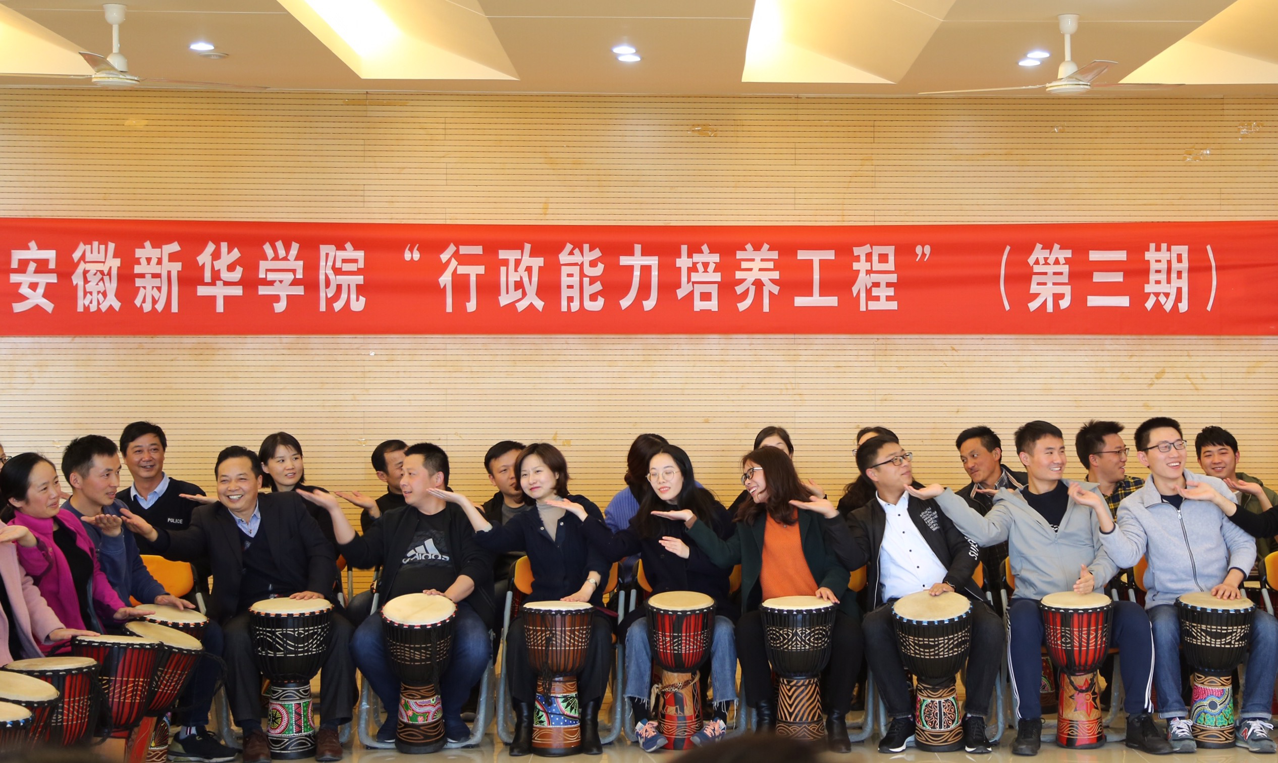 学院办公室还特别安排了“鼓舞飞扬”素质拓展活动,学员们在教练的指导下学习激情四射的非洲鼓。通过两个多小时的学习以及队友之间的不断磨合,各小组成员最终成功演奏出同一个旋律。