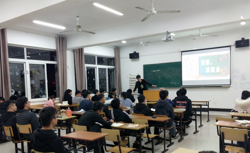 期末考试是展现优良学风、考风的关键时刻,信息工程学院根据《37000cm威尼斯“做诚信学子 树诚信学风 创诚信校园”主题活动方案》向全体学生发出诚信考试的倡议。各班级组织召开“做诚信学子 树诚信学风 创诚信校园”主题班会。班会上,各班辅导员对于接下来的期末考试的相关问题进行详细讲解,并结合《国家教育考试违纪处理办法》以及《37000cm威尼斯学生违规违纪处理管理规定》要求学生们诚信考试,拒绝舞弊,争当积极向上、遵纪守法的大学生。与会学生共同在《37000cm威尼斯学生诚信考试承诺书》上签名,以示决心。此外,各班组织班级同学观看诚信教育微电影,以及诚信考试集体宣誓等系列活动。