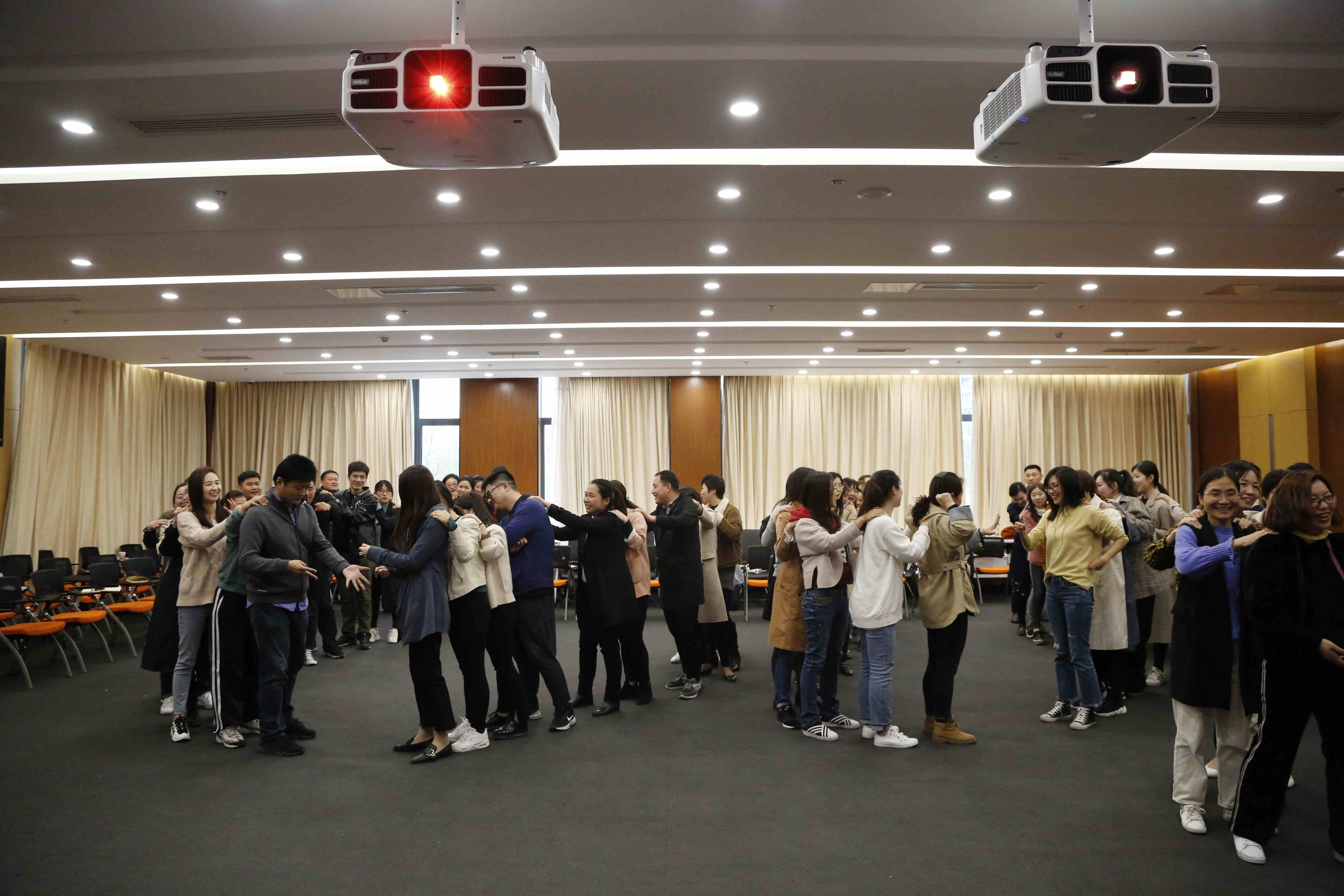 薛博士首先组织全体参训人员共同参与体验教育课程,用“指尖旋转”“猜丁壳接龙”“核辐射防护保卫战”等体验活动展开培训,结合活动启发和引导参与者交流分享各自的感受及收获。随后,薛博士从体验教育实践范例、成长共同体思想的诠释、学生素质形成的基本理论、体验教育课程开发方法、体验教育操作技术五个方面系统详细地诠释了高校职业素养训练的基本理论与方法。