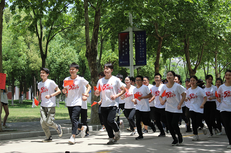 “青春心向党·建功新时代”活动在响亮的口号声中拉开序幕,54名身穿带有“五四”图标的白色T恤衫的青年学生们组成了一个整齐的方阵,在齐跑之后开始了接力赛跑,1919米,是他们对奋斗史的丈量,每一次的击掌接力也是他们对“五四”精神的接力,他们青春洋溢,一路跑,一路加油呐喊,挥洒着青春的蓬勃朝气。接力跑后,由130人组成的合唱团来到如琴湖广场,共同歌唱《我的祖国》,艺术青年用富有力量的青春之声歌颂祖国,表达对祖国的热爱。随后,王琪琛同学带领大家重温入团誓词,学生们高举右手,庄严肃穆的场景下回荡着青年学生热情的宣誓。