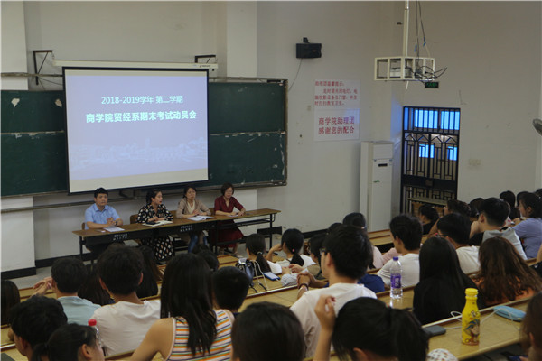 本网讯(通讯员:王超)为响应近期教育部对本科生“合理增负”的号召,落实“把课堂教学建设强起来、把课堂教学质量提起来”,以及“要全面梳理各门课程的教学内容,淘汰“水课”、打造“金课”,合理提升学业挑战度、增加课程难度、拓展课程深度,切实提高课程教学质量”的相关精神,2019年5月22日中午,威尼斯官网商学院贸经系在教5,319针对国际经济与贸易、电子商务和商务经济学3个本科专业、5个班级的大一学生举行了期末考试动员会。