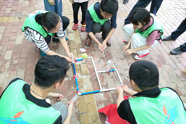 在随后进行的“挑战巅峰”项目中,各组通过将给定道具组装成底坐,众人齐心协力用细绳把球体运送底座顶端。通过群策群力,不断尝试新方法,顺利完成了看似不可能完成的任务,强化了教职工的逻辑思维,激发了创新思维。