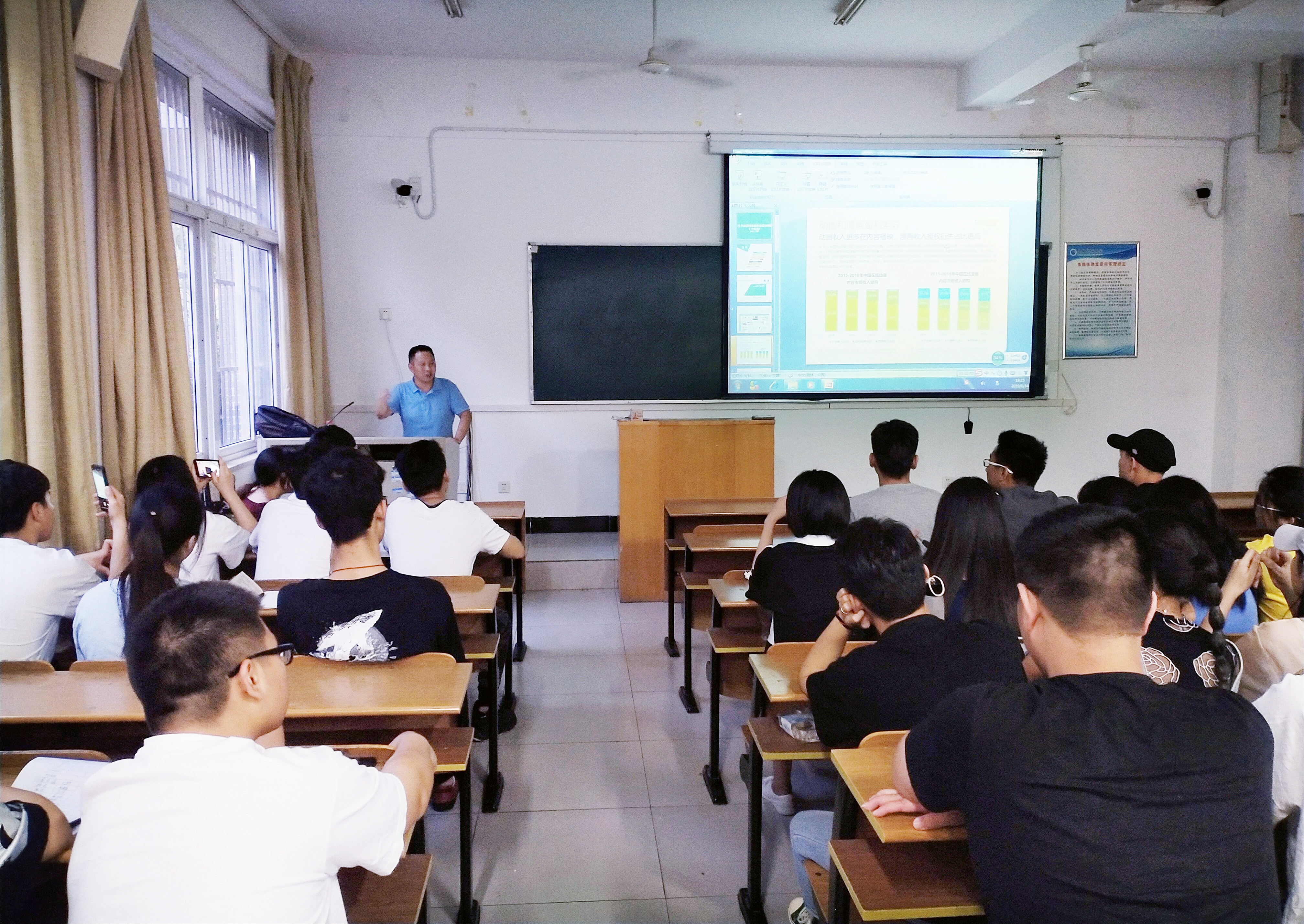 王超先生根据自己在安徽出版集团十余年的工作经历以及在安徽省内外多家动漫相关的制作公司合作和设计的经历,着重分析了广告动画、插画动画、漫改动画等多种动画形式在商业市场的前景,结合真实案例、自身创作项目经历,介绍了动画创作的经验,并对社会外界人士对动画就业和市场认识的一些误区进行和分析和纠正,针对艺术学院动画系学生的学习进行了模块化指导,对学生的未来学习和就业指明方向,得到全体师生的一致好评。