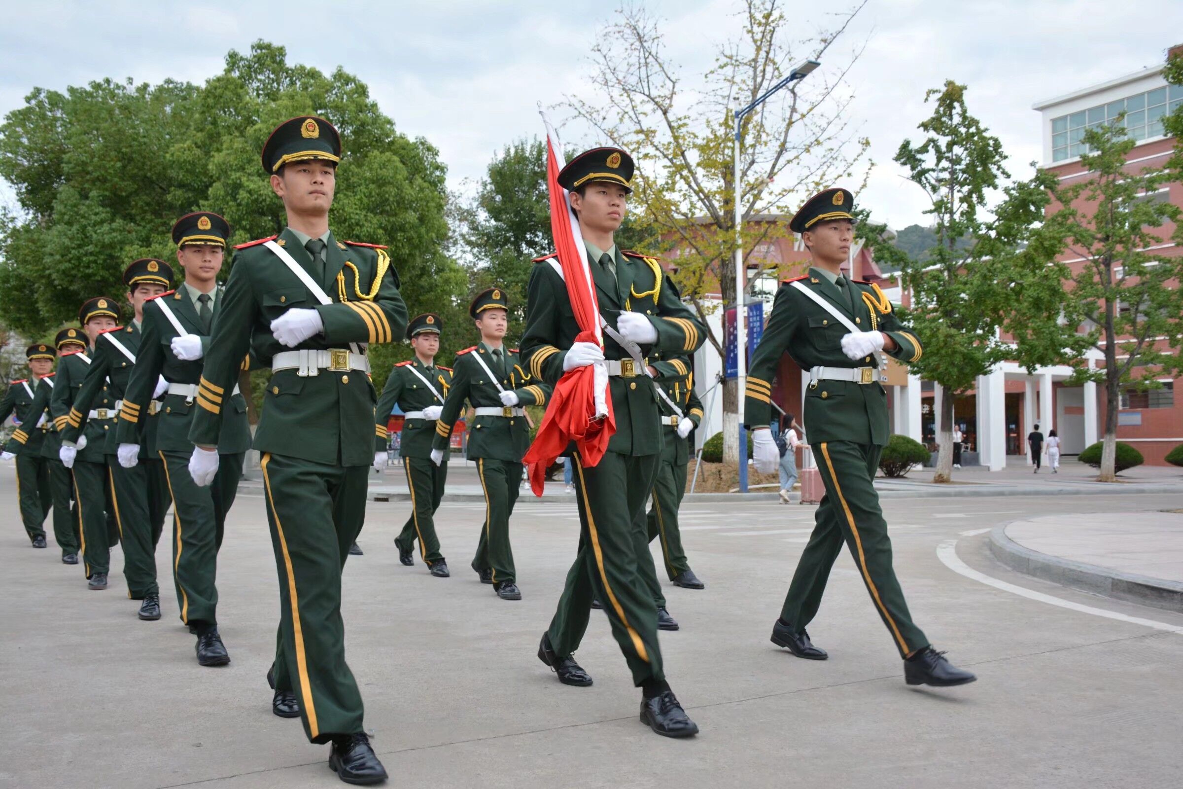 英姿飒爽的国旗护卫队队员护卫着鲜艳的五星红旗踏着整齐的步伐入场。在场的每一个人怀着对祖国无限的热爱和对浴血奋战的先烈们崇高的敬意高唱义勇军进行曲。