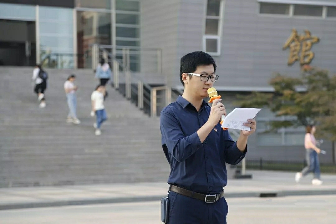 首先,由教师党员代表沈跃龙进行微党课宣讲,他带领着师生们回顾中华历史,致敬爱国人士。他说:爱国主义是中华民族的精神支柱,是炎黄子孙高尚的美德。心怀爱国之心、实践爱国之行,这既是祖国强大的保障,也是每一个炎黄子孙的责任担当。