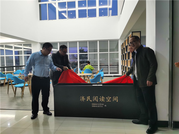 郑兰中、张雷及宋龑(安徽非羽网络科技股份有限公司董事长,商学院2006电子商务1班学生)非常关心商学院的发展,为给学弟学妹们创造更好的学习环境,共同出资在商学院建造了“经世”、“济民”阅读空间。最后,翟荣兵与校友们共同为校友“经世济民”阅读空间揭牌。