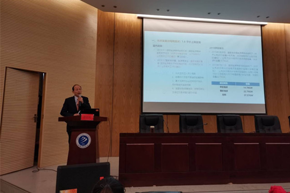 讲座围绕光伏发电系统展开。屠运武首先介绍了国内外光伏发展历程和现状,接下来为大家讲解了光伏组件技术、光伏支架技术以及逆变器技术,并从双面组件+跟踪、提升系统直流电压,优化线缆、技术创新,促进平价几方面,详细介绍了光伏系统技术。讲座的最后,屠运武介绍了阳光电源股份有限公司的主要业务与人才需求。