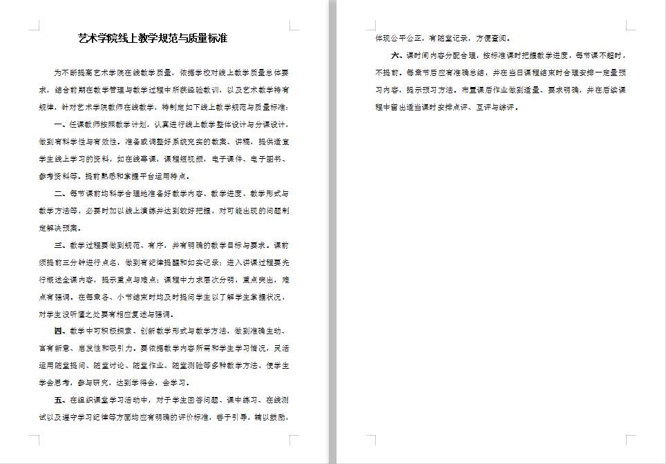 本网讯(通讯员:杨蕊)为不断提高艺术学院在线教学质量,依据学校对线上教学质量总体要求,结合前期在教学管理与教学过程中所获经验教训,以及艺术教学特有规律,针对任课教师在线教学实际,艺术学院适时制定了《线上教学规范与质量标准》,经组织全体教师学习后在各专业线上教学中全面认真执行。