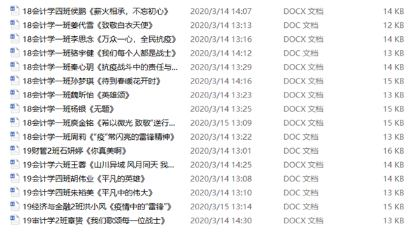此次征文活动以文件发布的形式发至各班级团总支,面向财会与金融学院2018级、2019级全体学生开展,在文件发布后的瞬间就得到同学们的大力支持与积极响应,本次活动共提交作品68篇。经过团总支初评、学院领导再次复评后,共遴选出《薪火相承,不忘初心》、《山川异域 风月同天 我们共待春暖花开》、《“疫”常闪亮的雷锋精神》等优秀作品35篇。