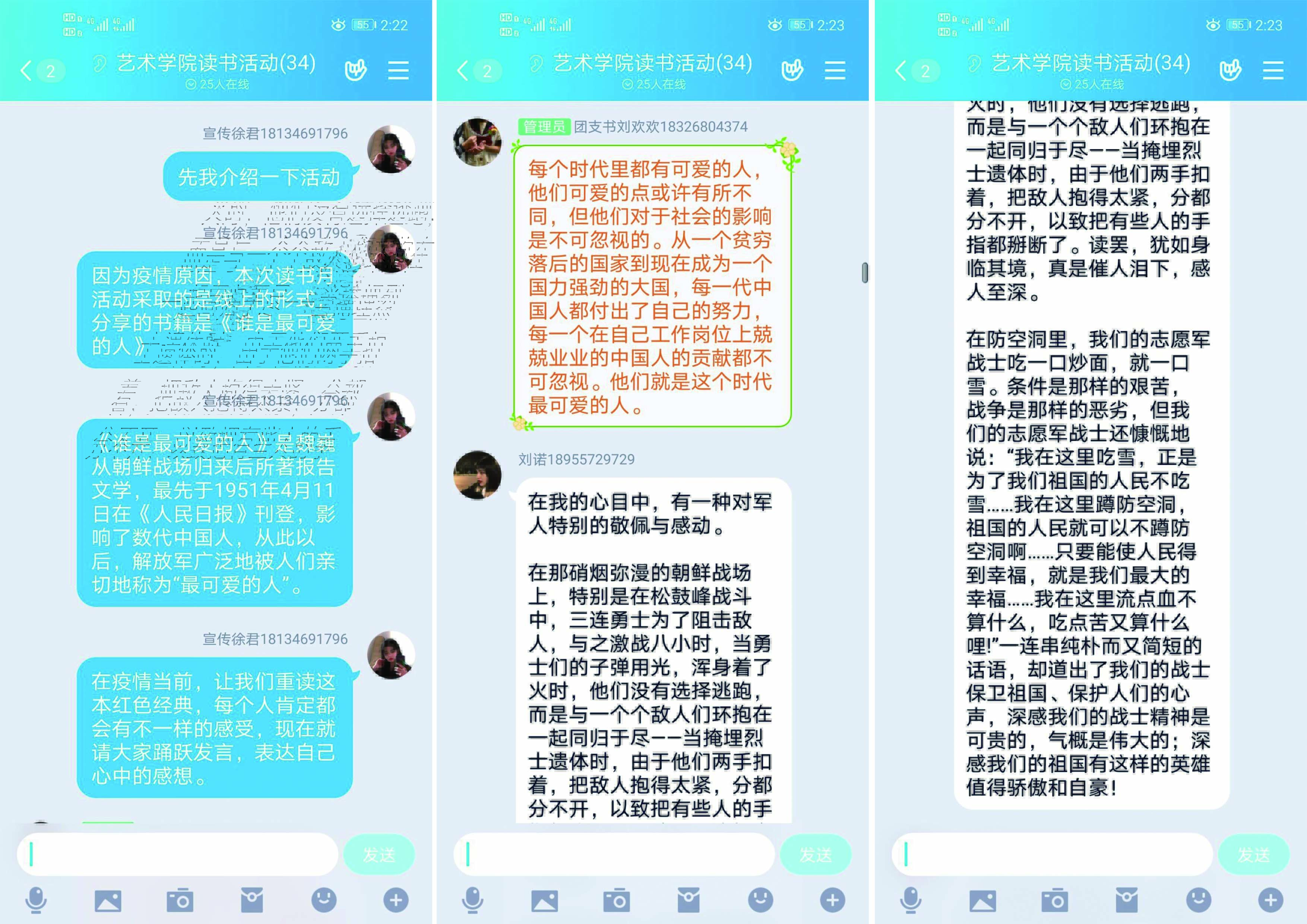 艺术学院2019级视觉传达设计2班举行了线上读书活动,本月分享书籍为《谁是最可爱的人》,热情讴歌了中国人民志愿军在抗美援朝战场上的英雄事迹。活动开始主持人发言,介绍了本次活动的流程,包括读书分享、事迹分享等环节。随后由班级成员依次分享了各自的读书收获,很多同学结合了疫情期间的一些感人事件进行交流,活动氛围十分浓厚。最后主持人进行了活动总结,呼吁大家一起珍惜现在来之不易的幸福生活,缅怀革命先烈,向英雄致敬,牢记使命,奋发图强,做新时代“最可爱的人”。