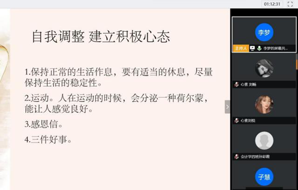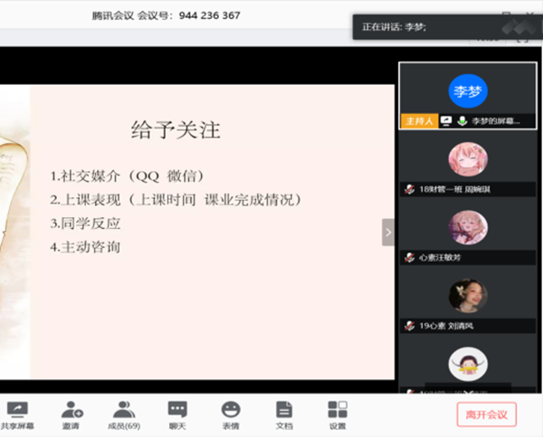 培训中,李梦从学生心理困扰类型、评估方法、谈话技术及自我心理调适四个部分与心理委员分享了在疫情期间班级心理工作的方法和重点。