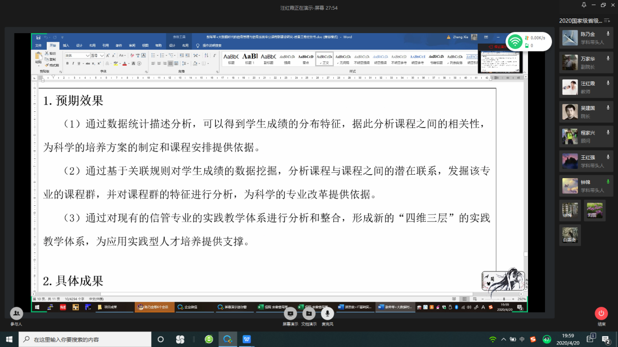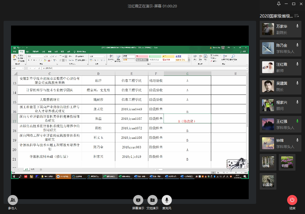 本网讯(通讯员: 汪红霞)根据37000cm威尼斯《关于开展国家级、省级、校级“质量工程”项目年度检查验收工作的通知》文件要求,为进一步加强省校级各类“质量工程”项目建设与管理,更好地推进各项目的顺利实施,提高各项目检查验收的质量,4月20日,信息工程学院通过企业微信平台召开2020年“质量工程”项目检查验收评审会,中国科学院合肥智能机械研究所王红强教授、安徽工程大学陈乃金教授、合肥师范学院钟锦教授,信息工程学院顾问程家兴教授等9名校内外高级职称专家组成评审组。会议由吴建国主持。