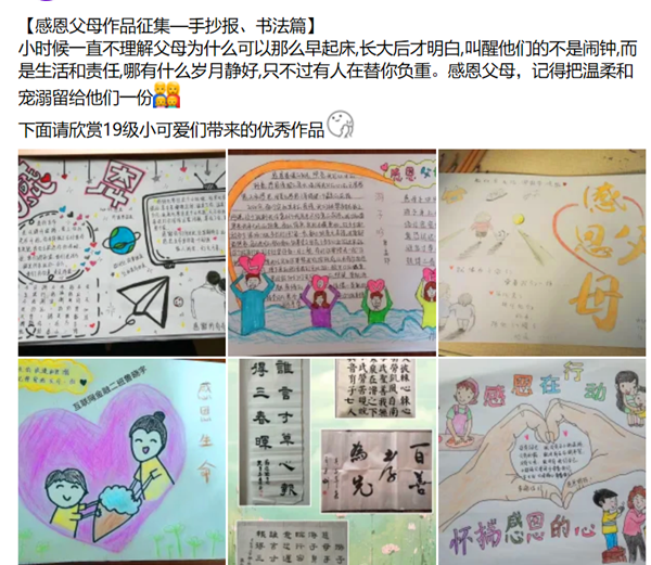 财会与金融学院举办了以感恩父母为主题的云端作品征集活动,鼓励同学们通过书信、绘画、视频等形式表达对父母的感恩之情。本次活动得到了同学们的积极响应,收到110余份感恩作品。以此活动为契机,鼓励同学们居家期间,积极参加家庭活动、表达感恩,建立良好亲子关系,为居家学习建立良好的家庭环境和氛围。