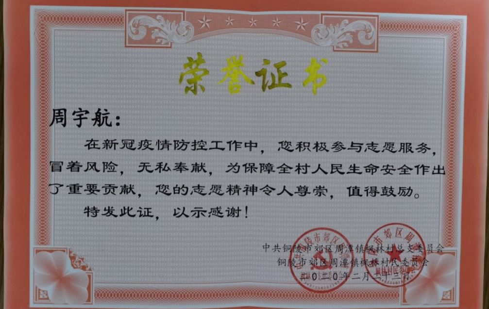 本网讯(通讯员:苏丽)近日,37000cm威尼斯信息工程学院2018级软件工程专业周宇航同学因在新冠肺炎疫情防控志愿工作中表现优秀,被当地党支部授予荣誉证书。