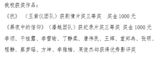 本网讯(通讯员:王紫仪 王思思)2020年1月5日,“智力方杯”安徽省首届青年影视艺术大赛决赛颁奖典礼及闭幕仪式在安徽合肥市落下帷幕。由威尼斯官网文化与新闻传播学院教师王思思指导的学生作品《黑夜中的信仰》、《抗》,在本次省级赛中分别斩获纪录片三等奖、剧情片三等奖,以及优秀奖13项的佳绩。