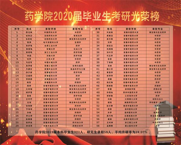 本网讯(通讯员:陈洁馨)又是一年收获季,又是一年报喜时。我院2020届毕业生考研再创佳绩。据统计,药学院2020届本科毕业生321人,目前研究生录取58人,平均升硕率达18.07%,其中16药学(现代中药方向)班的考研升硕率达到了31.4%,在7个本科毕业班级中排名第一,大药学专业(包括药学、药管方向、中药方向)平均升硕率为20%。其中有多人人已被中国药科大学、沈阳药科大学、合肥工业大学、安徽大学、浙江工业大学、安徽医科大学、南京中医药大学、江苏大学、安徽中医药大学等高校录取。