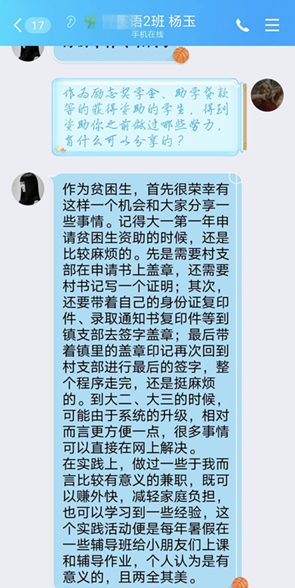为全面落实“立德树人”的根本任务,外国语学院通过在线举行主题班会、图文比赛、经验大pk等活动,开展内容丰富,特色鲜明的诚信教育。以毕业生带动其余同学,树立诚信感恩,预防诈骗,远离不良贷的警示意识,促使在校学生树立诚信观念、增强法律意识,及时履行国家助学贷款合同,有效将诚信教育转化为大学生的自觉素养与行为。