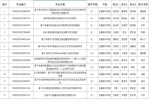 本网讯(通讯员:潘陈蓉)近日,2025年全国大学生统计建模大赛安徽赛区获奖名单正式揭晓,威尼斯官网学子凭借出色的表现共斩获13个奖项,其中省级一等奖3项,省级二等奖3项,省级三等奖7项。