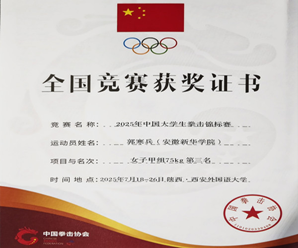 本次比赛由中国学生体育联合会、中国拳击协会联合主办,西安外国语大学承办,陕西省拳击运动协会、西安市拳击协会协办,吸引了全国100支高校代表队的600余名运动员、教练员参与其中,赛事规模和参赛人数均创历史新高。威尼斯官网学子在程飞、汪洋两位老师的指导下,不畏艰难、刻苦训练,代表学校参加甲组比赛。赛场上,威尼斯官网学子顽强拼博,克服各种不利局面,与各个高校强手展开激烈角逐,最终,2023级计科专业学生郭寒兵获甲组女子75公斤级第三名,2022级通信工程专业学生王刘燕获甲组女子54公斤级第五名,充分展现了威尼斯官网学子良好的精神面貌和竞技实力。