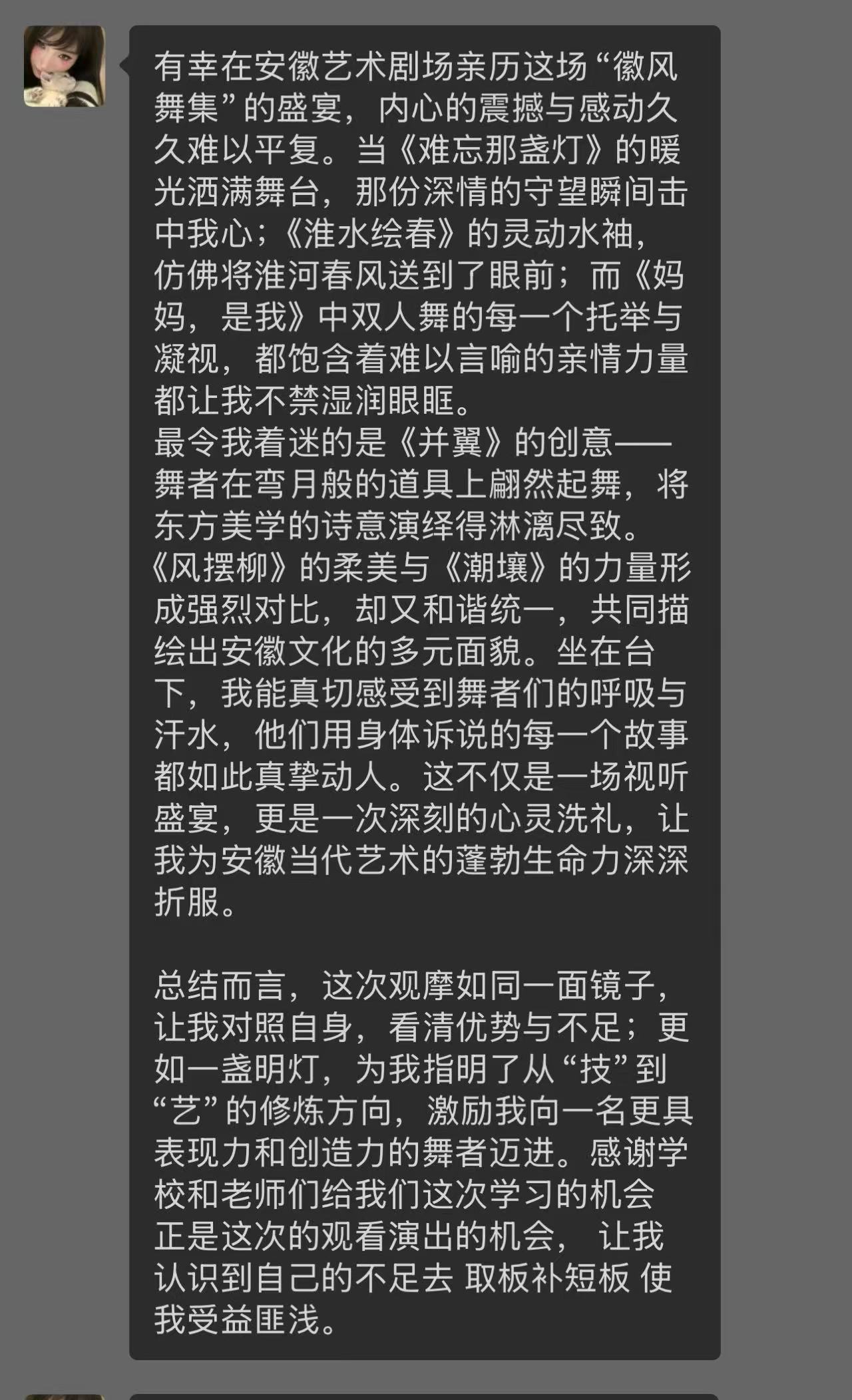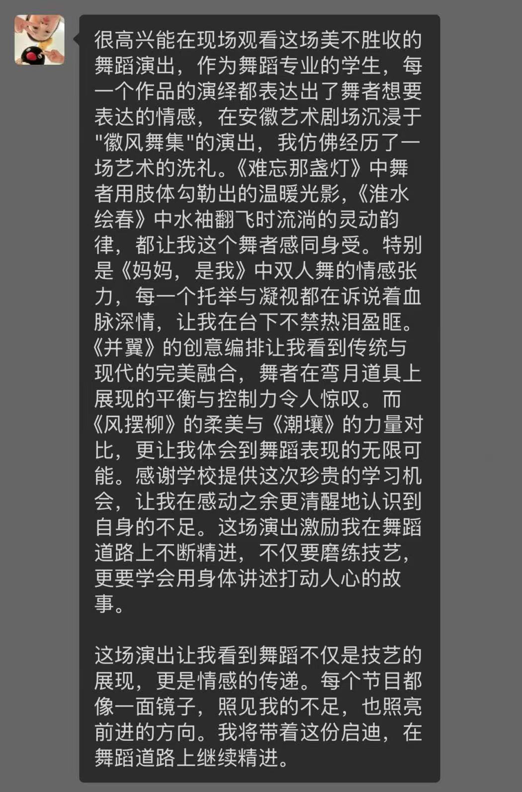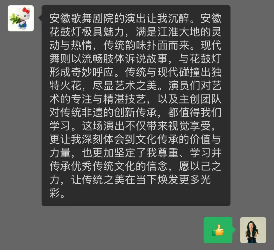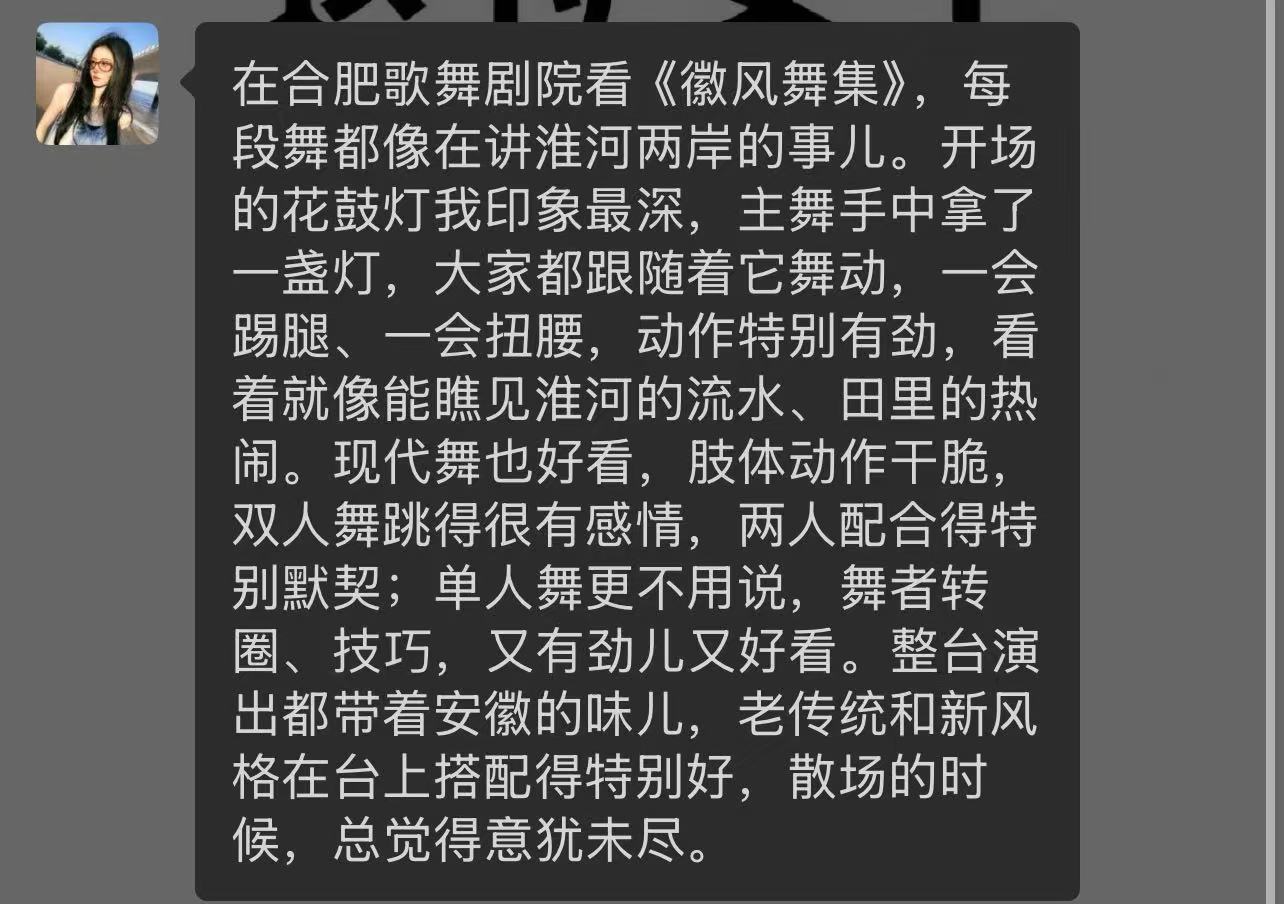 演出期间,师生们始终保持专注,时而记录舞台细节,时而沉浸于情感表达。大家纷纷表示,这场演出不仅展现了安徽省歌舞剧院演员们的精湛技艺,更彰显了艺术扎根文化土壤的创作智慧。"