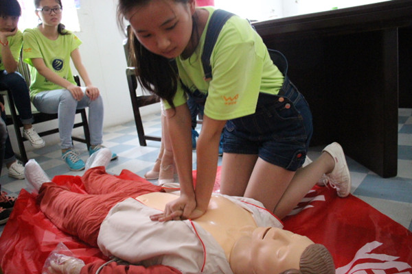 6月26日下午,卫生院院长为实践队队员上了一堂关于急救知识的现场教学课程,各位成员认真听课,积极提问,最后在老师的示范下,一一练习了心肺复苏术(CPR)的操作步骤。