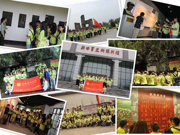 为纪念反法西斯战争与抗日战争胜利70周年,实践队来到了皖南事变主战场标记物纪念广场,重温入团誓词。随后,实践队参观了新四军军部旧址及新四军史料陈列馆,并徒步20公里重走新四军之路,深刻了解了新四军为保家卫国所作出的牺牲与贡献。当实践队员们路过东流山脚下的一座峭壁时,带队老师洪威告诉实践队员们这正是当年七位新四军女战士为逃脱国民党抓捕跳崖的地方,队员们怀着沉重的心情闭上眼睛,默默为这七位女英雄哀悼。最后,实践队员们登上了海拔890米的赤坑山蜜蜂洞,缅怀在这里被叛徒杀害的新四军副军长项英、副参谋长周子昆等烈士,受到了一次强烈的爱国主义教育。