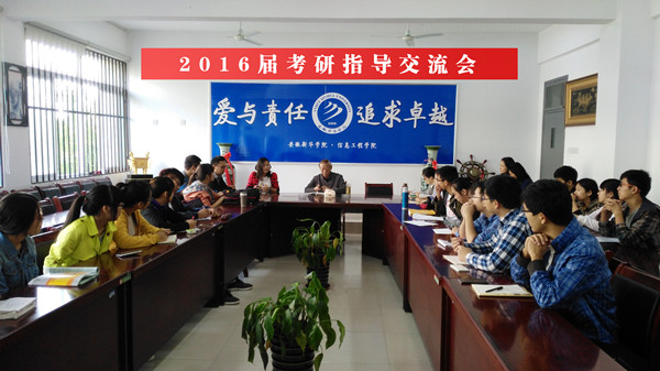 本网讯(通讯员:祝静静)为提高2016届毕业生的考研升学率,10月12日上午,信息工程学院举办考研指导交流会。信息工程学院顾问程家兴,李恋、陶丽娜等教师代表参加,邀请了目前就读于安徽大学图书情报的朱少红、计算机科学与技术专业的王冉返校与同学们面对面交流。