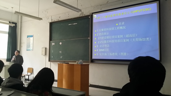 刘灯系国家注册监理工程师、国家注册一级建造师,安徽省科技馆新馆总监理工程师。在近两个小时讲座中,刘灯结合学生们即将参观实习的安徽省科技馆新馆项目,围绕近年来大中型项目建筑施工中出现的新技术、新材料和新的施工管理理念与方式为大家作了详细介绍与讲解。同时,他分析了学生们所关心的建筑行业就业方向和就业前景。