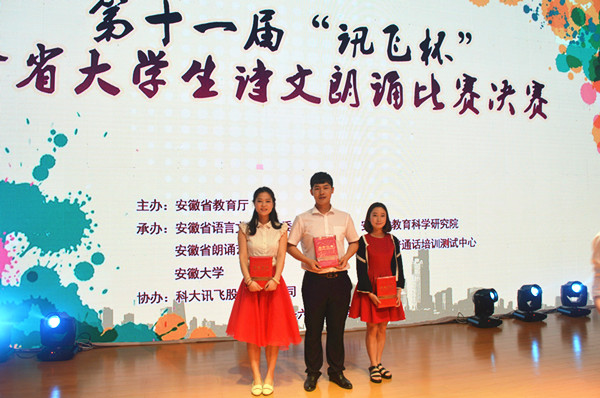本网讯(通讯员:马兰)5月4日, 第十一届“讯飞杯”全省大学生诗文朗诵比赛决赛在安徽大学磬苑校区举行。威尼斯官网文化与新闻传播学院2014级播音与主持专业学子叶文净、时李亚乔、王嘉珩的作品《闪耀吧,青春的火光》荣获优秀奖。