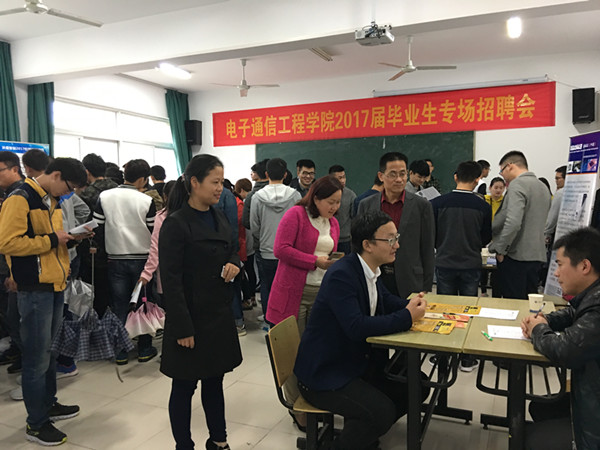本网讯(通讯员:朱玉娟,摄影:储金华)为切实做好毕业生就业工作,大力构建毕业生与用人单位的交流平台,10月26日下午,电子通信工程学院举办2017届毕业生专场招聘会,泰瑞达(上海)有限公司合肥分公司、昆山宏致电子有限公司、上海瑞禾通讯技术有限公司、合肥兴联通讯有限公司等28家企业现场招聘,约700名同学参加本次招聘会。