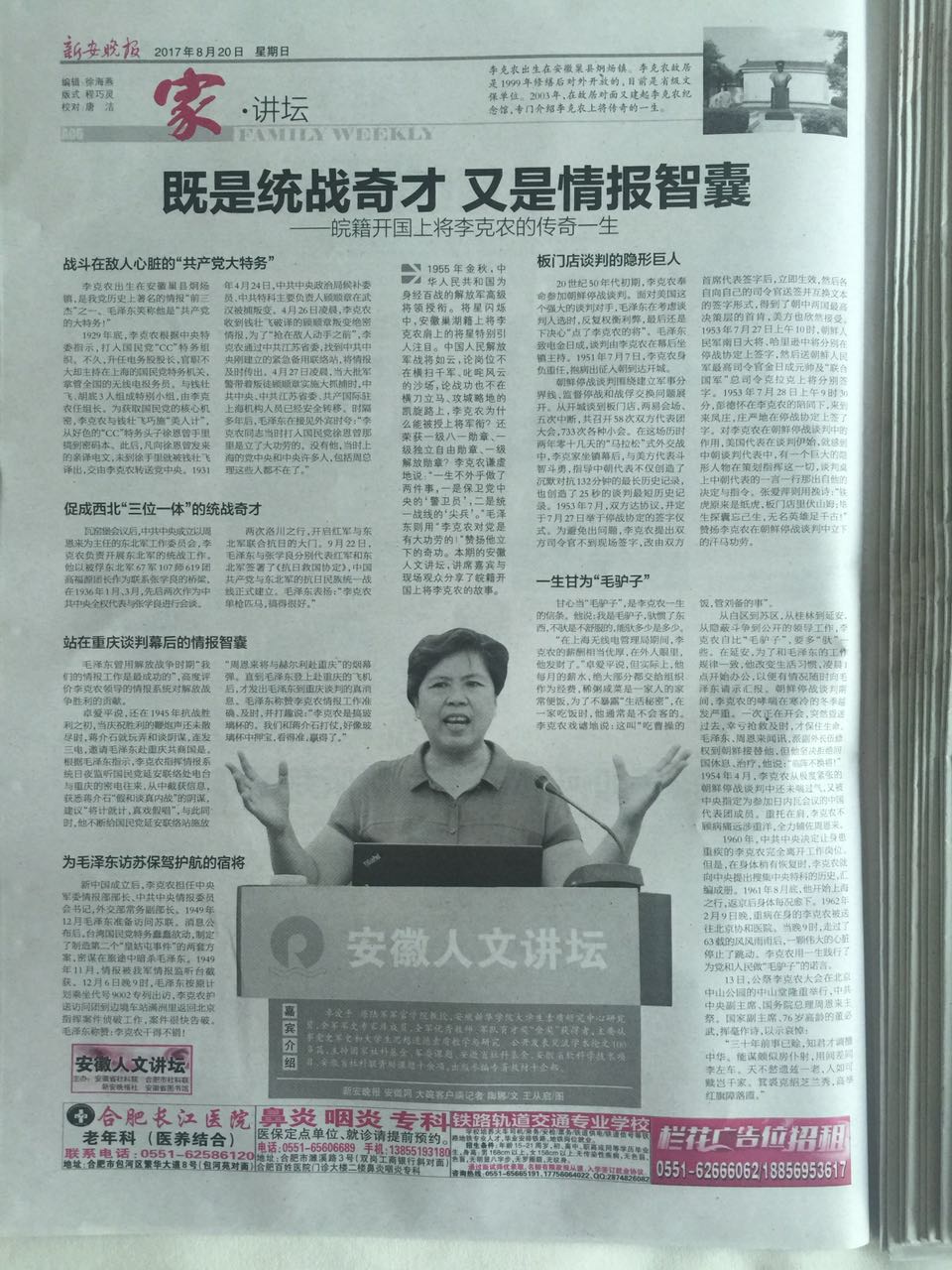 本网讯(通讯员:林斗秀)近日,大学生素质教育研究中心卓爱平教授做客“安徽人文讲坛”,为广大市民讲述皖籍开国上将李克农的事迹。讲座在安徽省图书馆东二楼学术报告厅举行。
