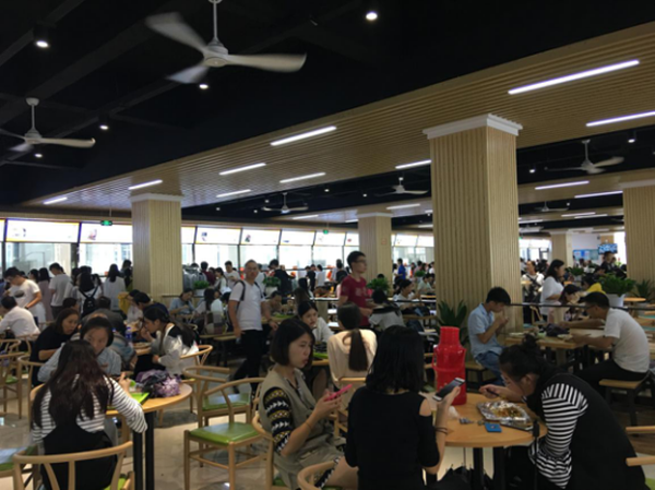 二期生活服务中心的新食堂依旧与商业街相毗邻,以方便师生一站式购物和就餐。三家学生食堂虽然装修风格炯异,但其硬件设施及后堂功能间的分隔和布局均是严格按照A级食堂标准进行的装修设计,改造后的食堂就餐大厅宽敞明亮,新式就餐桌椅及特色灯饰的布置使得校园餐厅更加具有青春萌动的时尚与活力,些许绿植的点缀也让热闹的就餐氛围里凭添了一丝温馨和惬意。