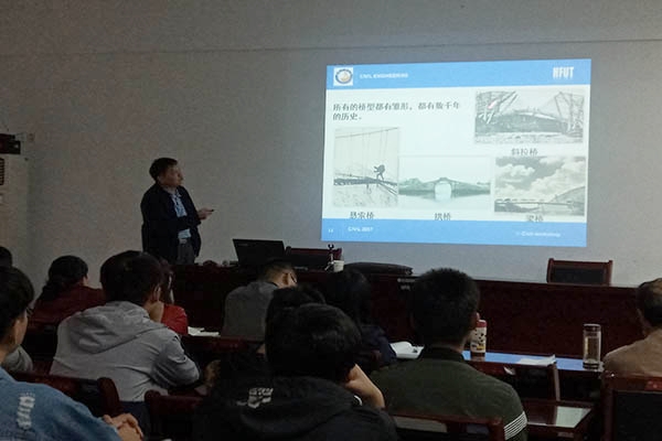 首先,王建国从桥梁的起源出发,进而引出桥梁的发展历史,着重讲解了悬索桥结构计算理论。为了加深现场师生对风荷载作用下悬索桥受力的理解,王教授以视频的方式例举了风毁的塔科马海峡桥案例,这也是悬索桥发展史上的一次重要挫折。接着,王教授介绍了我国悬索桥建设经过4次发展高峰,已经跨入国际先进行列,悬索桥结构计算理论也趋于完善。