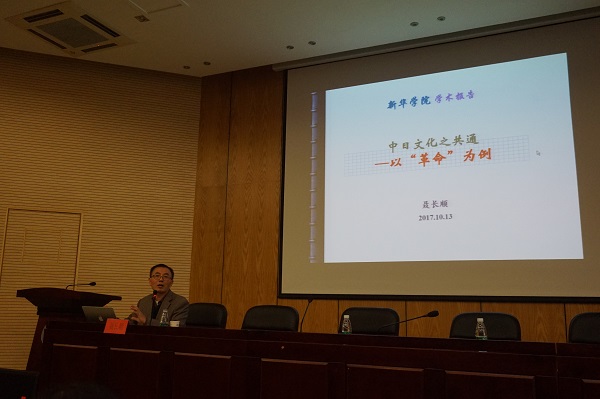 本网讯(通讯员:赵明)10月13日下午,外国语学院举办了“亚洲共同体”系列学术讲座第6讲。讲座邀请武汉大学中国传统文化研究中心教授、博士生导师、中日文化研究中心主任、日本创价大学访问学者、湖北智库文化战略研究院特聘研究员、国家“中华思想文化术语传播工程”专家委员会委员、历史组组长聂长顺教授作题为“中日文化之共通——以“革命”一词为例”的学术报告。外国语学院执行院长邵玲及日语系全体师生共计100余人出席聆听。本场讲座由日语系系主任宋志强主持。